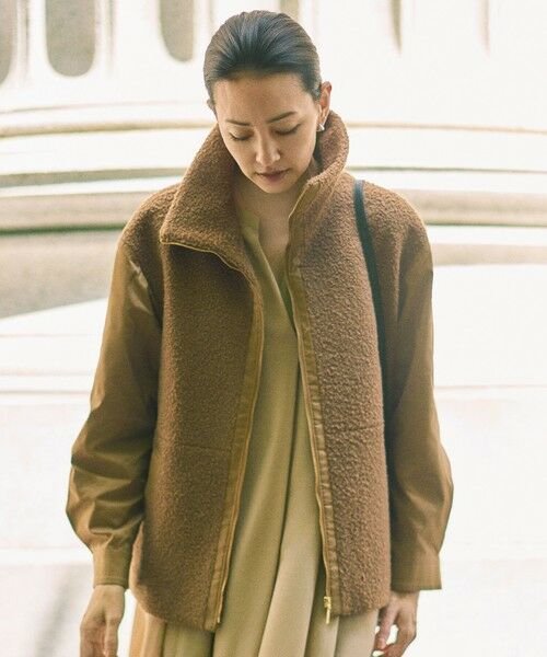 素材のコントラストが目を惹くアウター■デザインムートンのようなボアを使用した身頃と、サテンのようなしなやかな光沢感がポイントの別布をお袖にコンビネーションしたデザインアウターです。ボクシーなシルエットと程よくフォルムを出したお袖、高めのスタンドカラーが今年らしいバランスです。お袖を別布にすることでボアアウターにありがちな着ぶくれ感も少なく、スッキリと着て頂けるようデザインにこだわりました。ゴールドの光沢が美しいファスナーもポイントになっており、カジュアルになりすぎない大人の女性らしいアウターに仕上がっています。■素材ボア部分は、イタリアでデザイン監修をしているBARTOLOZZI(バルトロッティ)社のボア素材を使用しています。合繊100%ではなくウールを少し入れることで、カジュアルさは残しつつも程よくリッチなタッチのボア素材です。別布部分は中肉のタフタ素材です。しなやかさがありながらも美しいシルエットが出せる程よいハリ感が特徴です。