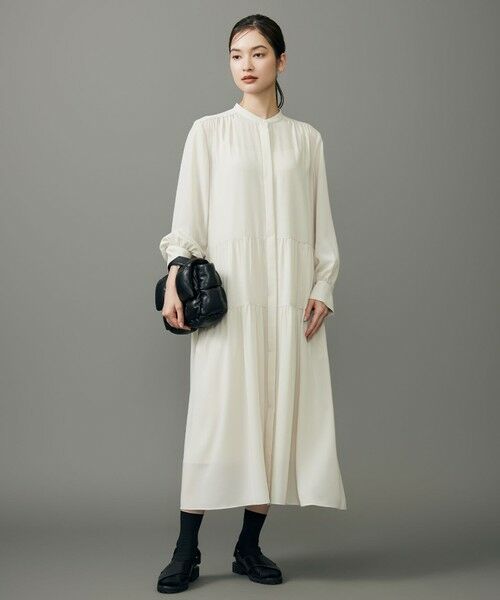 甘くなり過ぎず女性らしい印象のティアードドレス■デザインギャザーをたっぷり入れた華やぎドレスです。ティアードデザインのナローシルエットに、裾の切り替えからさらにボリューム感を持たせることで、華やかな女性らしい印象を演出してくれます。バンドカラーと、シャツっぽいカフスで甘くなり過ぎないよう大人っぽくまとめました。途中止まりの前開き仕様なので、着脱のしやすさも嬉しいポイントです。1枚でさらりと着映えるアイテムです。■素材異収縮混繊糸を使用した軽やかなデシン素材で、日本の加工技術により膨らみとドレープ性が特徴です。パウダリータッチに仕上げているので肌触りが良くさらりと着て頂ける素材です。※画像はサンプルを使用している為、実際にお届けする商品と仕様、加工、サイズが若干異なる場合がございます。予めご了承ください。※撮影環境の都合上、実際の商品と色味が異なって見える場合がございます。洗濯表示【本体】40℃まで手洗い可 塩素系漂白不可 タンブル乾燥不可 日陰つり干し乾燥 アイロンは160℃まで 弱いドライクリーニング可 弱いウェットクリーニング可