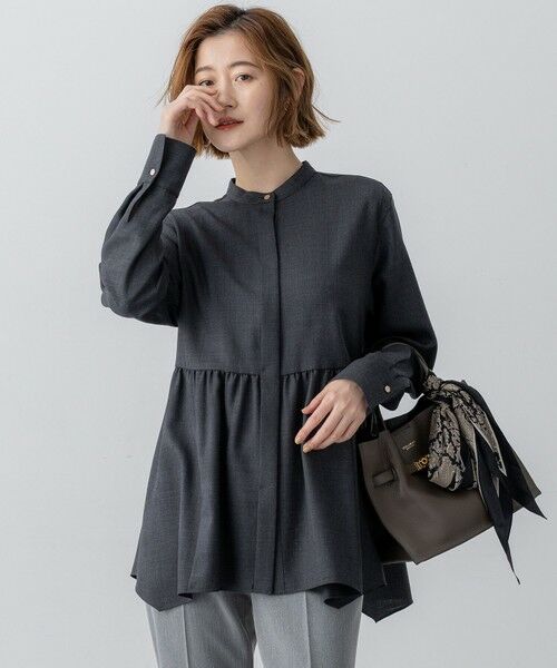 裾のイレギュラーヘムがポイントのデザインブラウスです。腰回りをカバーしてくれる長めのレングスなので、細身のパンツを合わせていただくとメリハリのあるスタイリングが叶います。また、同素材のワイドパンツやデニムのワイドパンツと合わせても今年らしいボリューム感のあるスタイリングをお楽しみいただけます。カラーは、こなれた印象のグレー(#004)と、品の良さを引き立てるネイビー(#075)の2色展開です。