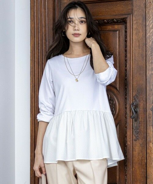 ・カットソーと布帛素材がドッキングされた異素材コンビカットソー・ペプラムデザインでスタイルアップが叶う一枚・ふわっとした広がるシルエットで、お腹や腰周りもさりげなくカバー