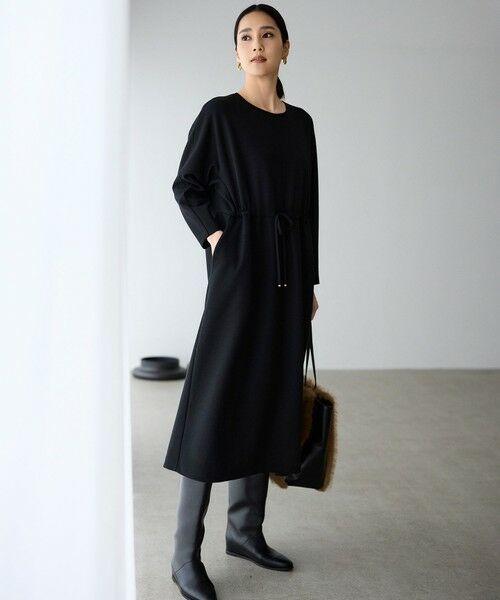 Iラインシルエットでもウエストを絞っても着て頂けるワンピース■デザインダンボールジャージで仕立てた変形ドルマンスリーブのワンピースです。たっぷりとしたボリューム感がありながらも袖口に向かってすっきりと細くなるお袖と、Iラインのシルエットが抜け感を感じられるデザインです。前ウエストにはドロスト入りで、少し絞ってウエストをすっきりさせてフォルムを変えても着て頂けます。■素材表にウール、裏にポリエステルを使用した薄い二重組織のキレイめな印象のダンボールジャージです。ダンボールジャージ組織ならではの程よいハリ感でカットソーでありながら体に張りつきにくく、美しいシルエットが表現できます。表面のウールは程よい温かみを感じられ、裏面をポリエステルにすることで滑りもよく機能的です。