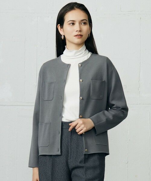 ジャケットライクなディテールがポイントのカーディガン■デザインアウターライクに着て頂けるカーディガンです。丸みのあるシルエットとメタル釦や4つのポケットがジャケットライクなディテールになっています。左上ポケットの裾には自由区のロゴが入っています。裏にポリエステルの弾力性のある糸を接結編みでドッキングすることで軽く程よいハリのある素材に仕上げました。■素材しなやかなビスコースにストレッチが入った、適度な落ち感のあるエレガントな素材です。着心地、肌触りが良く、上品な光沢感が特徴です。■同素材アイテムブラウスライクニット(KRW7GW0456)クルーネックニット(KRW7GW0457)リブインナーニット(KRW7GW0458)