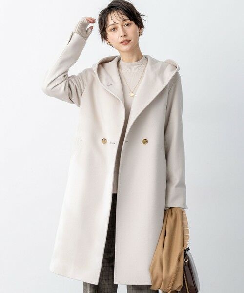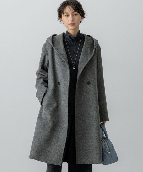 フードの形にこだわった1枚。釦をあけても閉めても決まる、お洒落さと防寒を兼ね備えたデザインです。程よくゆとりを持たせたシルエットなので、厚手のニットも着合わてももたつくことなく着ていただけます。長めのレングス感で設定していますが、ボトムを選ばず合わせられる万能アウターです。カラーは、柔らかいベージュ(#033)、都会的な印象のグレー(#004)、スタイリッシュなブラック(#005)の3色展開です。