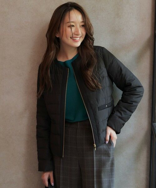 ・寒くなってきた時期にさっと羽織る軽いアウターとして重宝する一枚・本格的な真冬にはインナーダウンとして活躍・別布切り替えのジャケットライクなデザイン・ゴールド金具で女性らしさをプラス・腕周りにはゆとりをプラスし、着心地と動きやすさをアップデート・フィルパワー700以上の良質なダウン90%/フェザー10%を使用