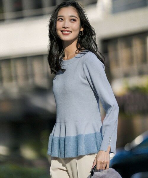 ・裾のペプラム×フェザーが可愛らしいニットプルオーバー・上品な開き加減のボートネック・袖口のゴールドボタンもポイントに