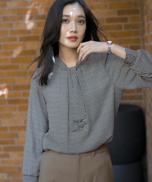 ・知的で華やかな印象に仕上がるボウタイブラウス・長すぎない着丈でウエストインしてももたつきにくく、きれいめにお使いいただけるデザイン・裏地が付いているのでインナーが透けにくい・千鳥(305)はバイカラーデザインで、1枚でも着映えします