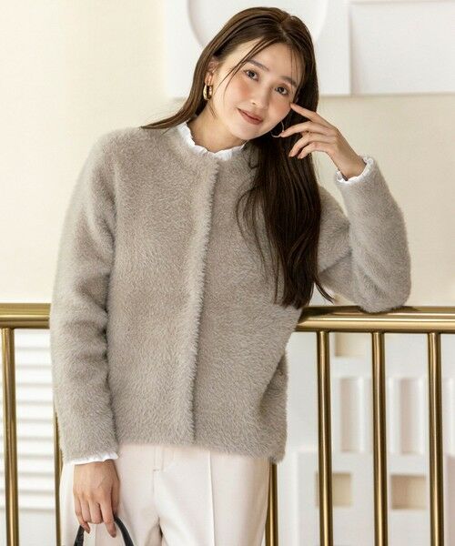 ・ふわふわシャギーが心地良いニットジャケット・しっかりと肉感がありつつもカーディガン感覚で気軽に羽織れる一着・後ろ丈を長めにした、ゆったりとしたシルエットで気になる腰周りをカバー・落ち着いたカラー展開でトレンド感のあるスタイリングを叶える