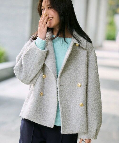 ・キラキラしたシルバーラメがポイントのショートコート・1枚で着映えするので、暗くなりがちな秋冬コーデにも大活躍◎・袖口のタックや後ろ裾のダーツなど、細部までこだわったデザイン・ゴールドのダブルボタンが華やかな印象・少しゆとりのあるさりげないコクーンシルエットがトレンド感満載・ボタンを1番上まで留めるとステンカラー、1番上のボタンを外すとPコートになる2WAY仕様