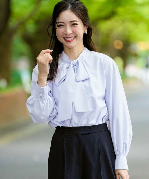 ・襟ぐりに華やかなギャザーを施し、ふんわりとしたボリューム感が魅力のボウタイ付きブラウス・ボウタイは取り外し可能で、スタンドネックブラウスとしても着用できる2WAYデザイン・少しゆとりのあるシルエットで、アウトでも可愛いフレア感を演出・着丈に前後差をつけているため、パンツアウトでもスタイリッシュに決まる・柔らかな素材なのでウエストインもきれいにまとまり、タイトスカートやハイウエストパンツとの相性も抜群