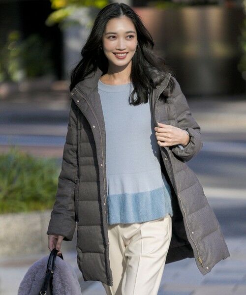・流行に左右されないシンプルなデザインで幅広いシーンで活躍するひざ丈ダウンコート・ウエスト付近のステッチを細くし、自然にすっきり見えが狙える美シルエットに・動きやすく、厚みのあるアイテムの上にも羽織りやすいサイズ感・ポケットは内側に起毛生地を使用し、暖かさを感じる仕様に・フードをとっても防寒性のあるスタンド襟・ゴールド金具のツヤ感がリッチな印象・フードに縫い付けたロゴプレートが後ろ姿でも映えるポイント・前立て部分にはファスナーとドットボタンの両方を装備