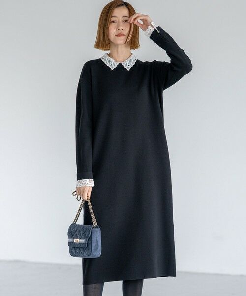 レースの襟・カフスを配した長袖ニットワンピース。レースのブラウスをレイヤードしているようなデザイン。人気のミラノリブベースでボディラインを拾わず着用いただけるシルエット。レースの襟・カフスはシーンに応じてお好みで取り外しが可能な仕様です。背面と袖口のボタンがアクセントになっています。学校行事や七五三など、とっておきのお出かけや食事会にも活躍します。両サイドポケット付き。カラーはオンオフ使いやすい2色展開。シックな雰囲気のブラック(#005)、品のよさを醸すネイビー(#075)です。