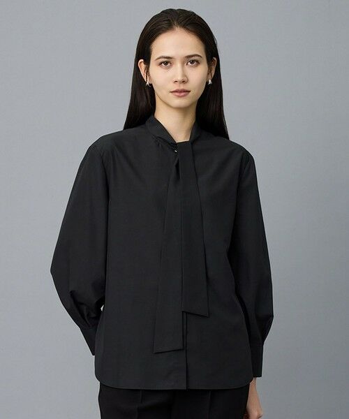 お顔周りを華やかに見せてくれるリボンがポイントのブラウス■デザイン大きなリボンディテールが特徴的なシャツブラウスです。程よい透け感のある軽い素材なので、大きなリボンも軽やかでお顔周りを華やかに見せてくれます。トレンドのボリューム袖は素材のしなやかな張り感で程よいアクセントとなっております。華やかなリボンやお袖にポイントがあるので、ツイードのジャケットやジレ、ニットなどのインナーにもおすすめです。■素材環境に配慮した原料を使用したシワになりにくいポリエステルタイプライター素材です。極細番手の糸を高密度に織り上げ、取り扱いやすさとシワになりにくさを求めました。ハリすぎないナチュラルタッチな風合いの素材です。■同素材アイテムスタンドカラーブラウス(BLW7LS0009)