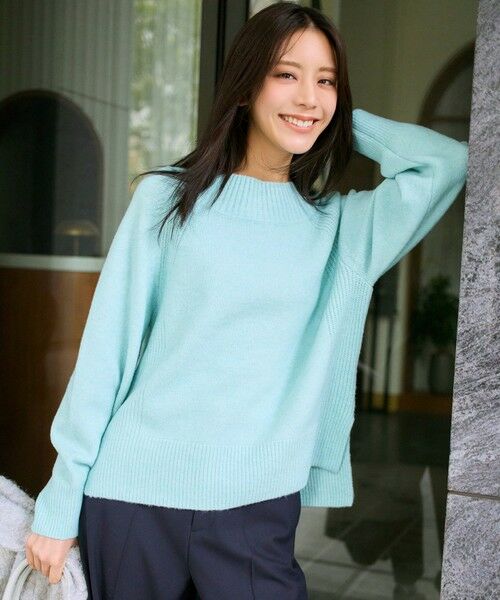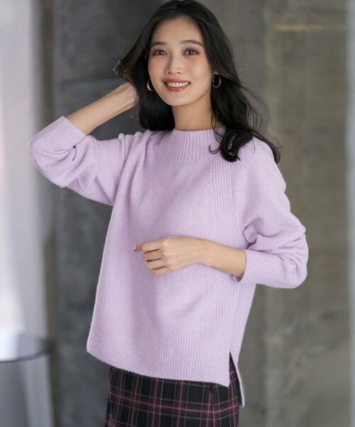 ・襟のリブがアクセントになったニットプルオーバー・身頃はややゆとりのあるサイズ感でリラックスした着心地・脇の編地切り替えがポイント・前後差のあるデザインでヒップ周りをしっかりカバー・スリット入りでどんなボトムスにも合わせやすい万能アイテム