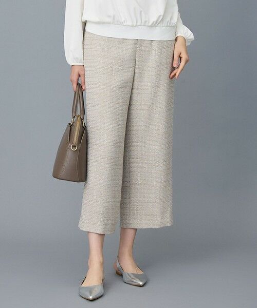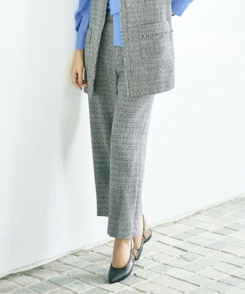 上品なツイードのパンツがアップデート■デザイン素材のしなやかさとウエイトでシルエットが綺麗に落ちるワイドストレートのツイードパンツです。ご好評いただいているパンツ(PRWMGS0010)から足首が見える長さにアップデートし、すっきりとした抜け感のあるバランスでお作りしています。ウエスト部分はベルトループ脇から後ろまでゴム仕様となっており、前は綺麗な見た目ながら着心地の良さもポイントです。同素材のジャケットやジレと合わせてセットアップでも着て頂け、セレモニーシーンにも活躍します。■素材カラーミックスされた糸と凹凸感のあるスラブ糸、繊細なラメ糸で華やかさを表現したラメミックスツイード素材です。軽くて柔らかく、繊細な光沢感が艶やかで、手触りも滑らかな上品なツイード素材です。■同素材アイテムジャケット(JKW7LS0010)ジレ(VRW7GS0010) ※画像はサンプルを使用している為、実際にお届けする商品と仕様、加工、サイズが若干異なる場合がございます。予めご了承ください。※撮影環境の都合上、実際の商品と色味が異なって見える場合がございます。