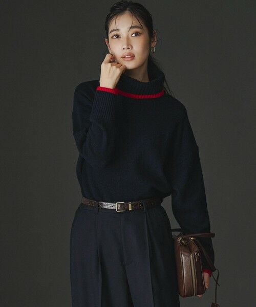 上質なウールカシミヤ素材を使用した、シンプルながらも洗練されたオフタートルニットです。襟と袖口に施された配色が、さりげないアクセントとなり、顔周りや手元を華やかに演出します。 やや体から離れるオフボディシルエットは、気になるラインを拾いにくく、リラックス感がありながらもすっきりとした印象に。細身のパンツと合わせてシャープに、Iラインスカートと合わせてエレガントにと、様々なボトムスと相性抜群です。両脇に入ったスリットが、デザインに軽やかさと動きをプラスし、こなれた雰囲気を醸し出します。 カラーは、知的な印象のグレー(#003)に遊び心のあるイエローの配色、上品で柔らかなベージュ(#033)に印象を引き締めるブラックの配色、深みのあるネイビー(#075)に華やかなレッドの配色をあしらった3色展開です。