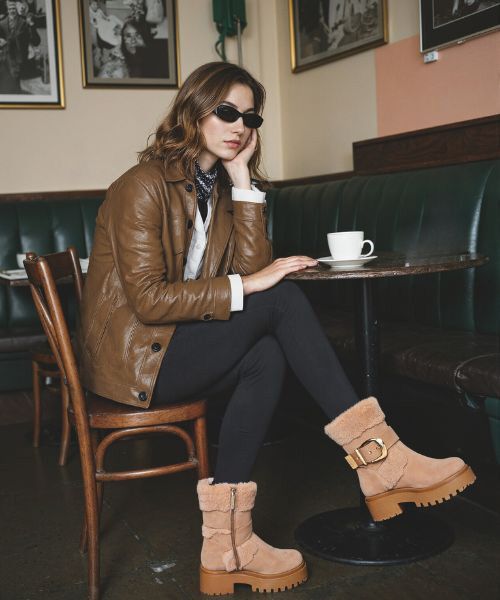 ふわふわのファーとエッジの効いたボリュームソールのコンビネーションが目を引く、旬感たっぷりのショートブーツ。