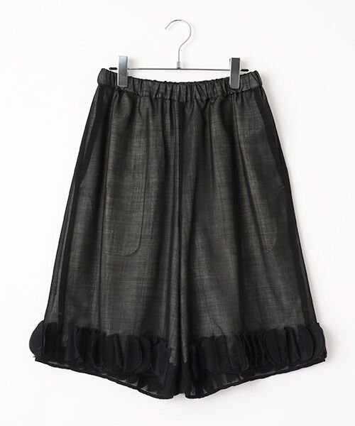 ドローストリングがついたウエストゴムのハーフパンツ。裾の立体的な装飾がポイント。表地に透け感があり、軽やかな印象を与えます。