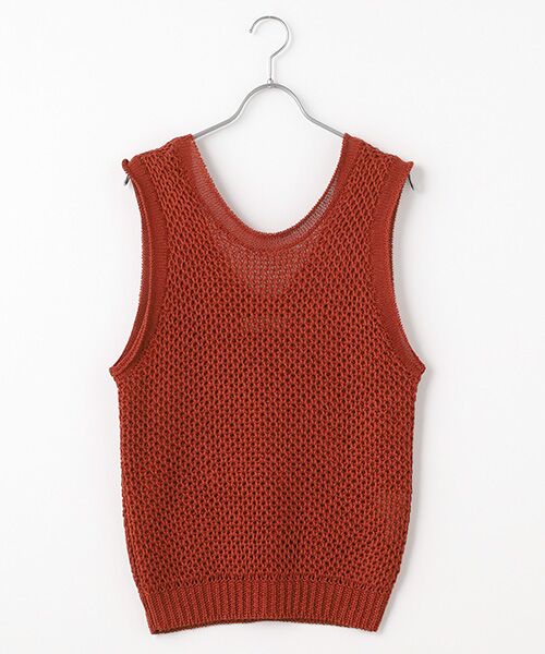 このリネンニットタンクは、ゆったりとしたUネックのタック構造と袖口の大胆なカットアウトがスタイリッシュなエッジを特徴としています。