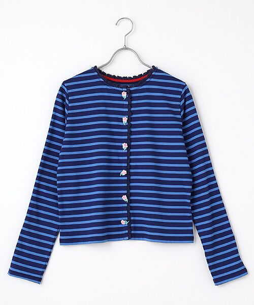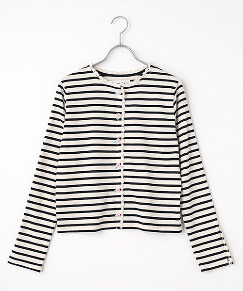 ヴィンテージローズパーツをボタンとして使用したボーダーカーディガン。襟と前端にコットンレースでトリミングしました。 コンパクトな着丈でボタンを全て締めてカットソー感覚でご着用いただくのもおすすめです。