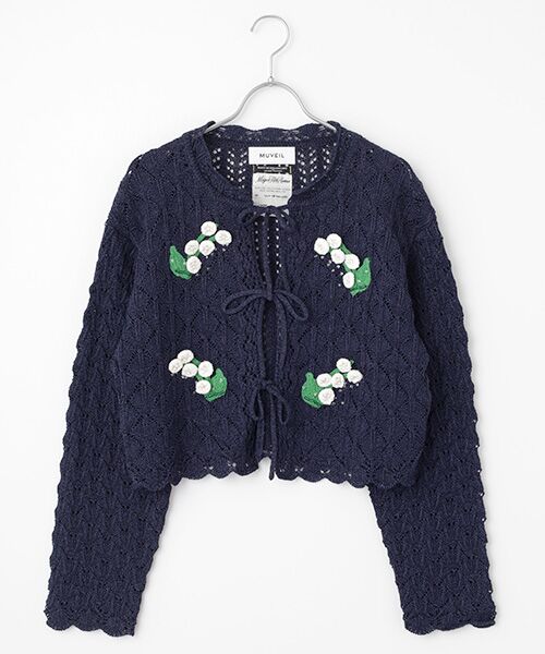 かぎ針の花々モチーフとビーズで立体的な刺繍がポイントのカーディガン。カラーによってアネモネ、スズラン、パンジーを添えています。レース編みでビスコースとペーパ―を使用したドライタッチなハリのある糸を使用しているので、網目が立って表情豊かに仕上げました。襟と袖、裾はスカラップでロマンティックな表情に。