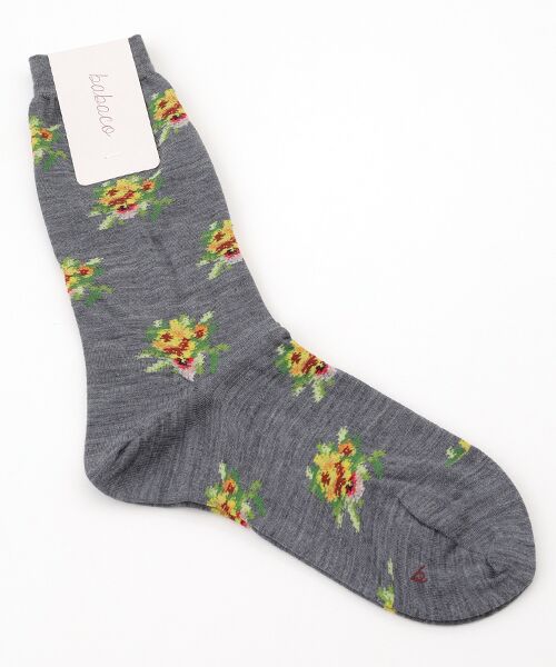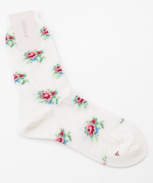 レトロな雰囲気の花柄が目を引くソックス。秋冬のコーディネートを足元から華やかに彩ります。履口の部分は伸縮性のある生地に切り替わっており、足首をしっかりホールドします。