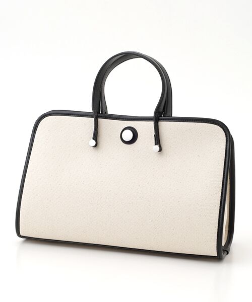 エッジをなぞる様に革で縁取られたデザインがポイントの‘’PLAZA‘’シリーズのハンドバッグ。口開きが良く、使いやすいサイズ感が魅力。控えめながら洗練されたデザインで、普段使いにぴったりです。本体には生成りのツイル帆布生地を使用し、撥水加工を施しているため、軽い汚れや水滴を防ぎ、毎日のお出かけにも安心。ハンドルやディテールには柔らかな牛革を採用し、高級感と実用性を両立。オリジナルの引っ掛け式マグネットがデザインのアクセントです。