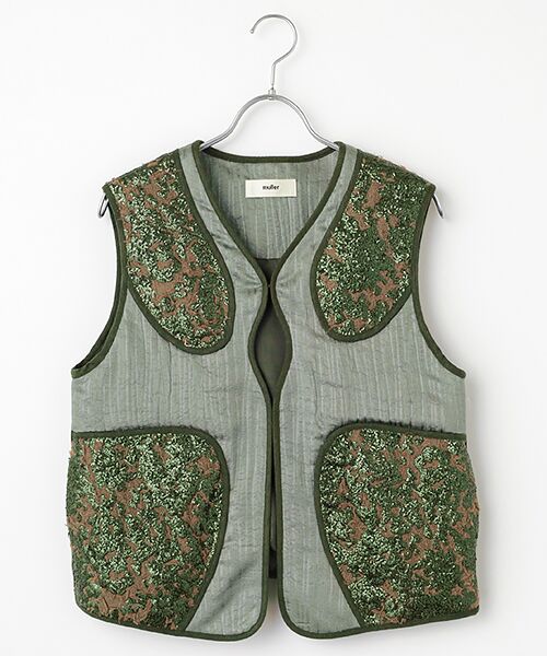 素材と装飾のコントラストが際立つ、表情豊かな異素材ミックスのベスト。立体的な刺繍が印象的ながらも、ラフに羽織れる気負わなさが魅力です。