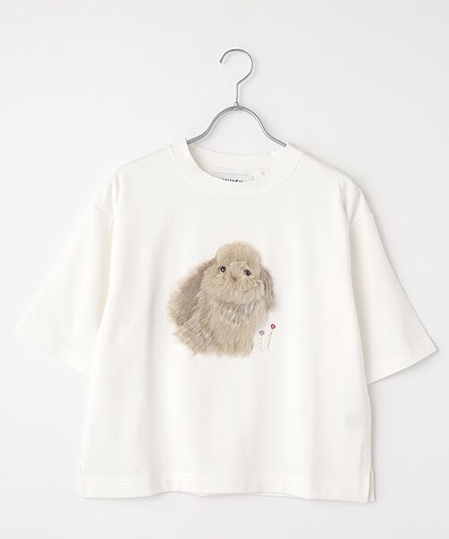 コレクションテーマに合わせて愛らしいウサギのファーアップリケを施したTシャツ。身頃はメンズライクな5分丈Tシャツで大人っぽく仕上げました。 ゆったりとした身頃でありながら丈は短めに設定しているのでどんなボトムスとも相性がいいです。 立体的に表現するため、数種類のファーを毛流れを変えて使用しました。フワフワの垂れ耳とビーズ刺繍のお花がポイントです。