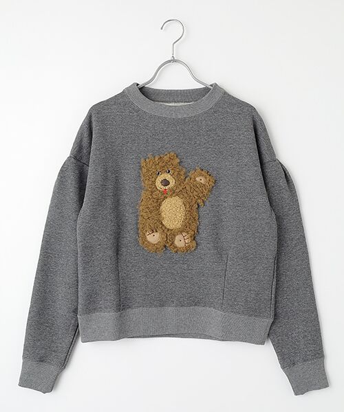 コレクションテーマに合わせて制作した愛らしい表情のクマを施した裏毛プルオーバー。クマを立体的に表現するため、異なる毛足のボア生地を使用しました。スエード生地を使用した肉球と立体的な丸いお腹がポイント。 ボトムに合わせやすい短めの着丈と、ダーツが入った立体的な袖で大人っぽくご着用いただけます。