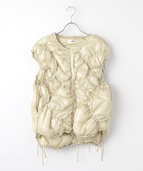立体的なキルティングが存在感を放つベスト。バストやウエスト位置を意識したシルエット設計で、身体を美しく見せるバランスになっています。ひとつひとつ手作業でギャザーを寄せた仕立てがポイントです。