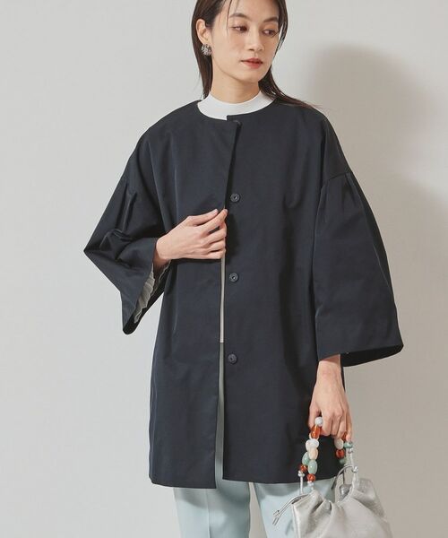 ボリューム感のあるフレアスリーブがポイントのノーカラーコート。