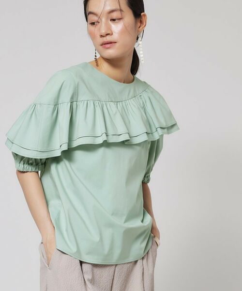 アシメに入ったラッフルが特徴なので、ボトムはシンプルに、カジュアルなスタイリングもお勧めです。