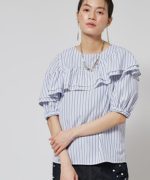 アシメに入ったラッフルが特徴なので、ボトムはシンプルに、カジュアルなスタイリングもお勧めです。
