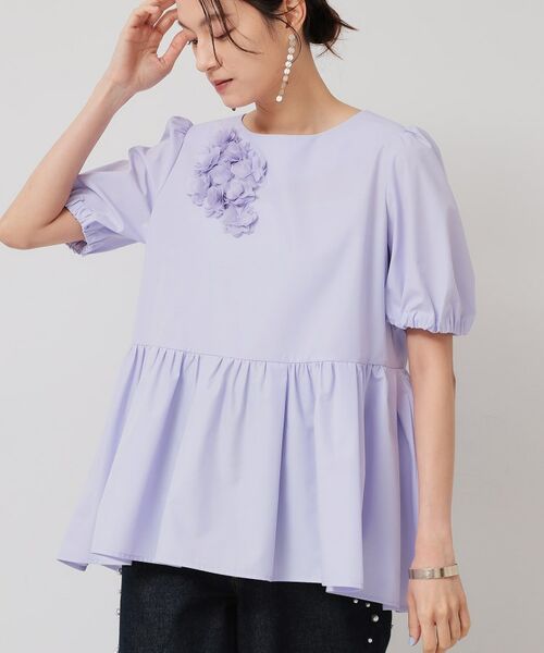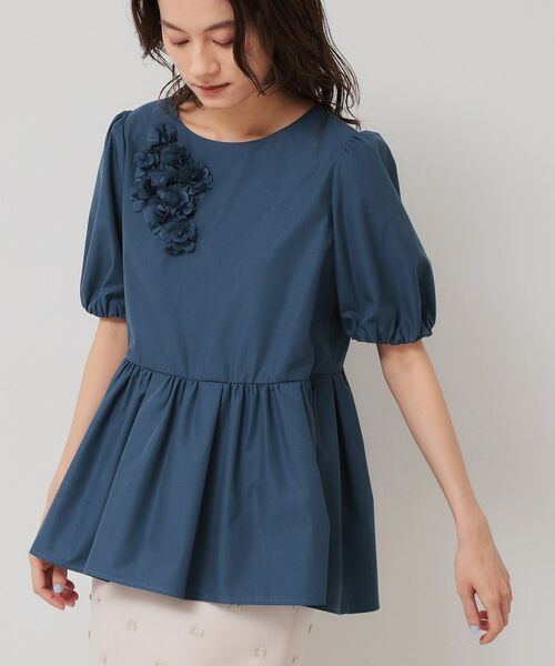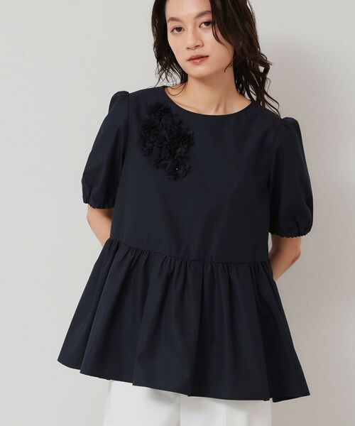 胸元のコサージュのようなモチーフがポイントのペプラムブラウス。