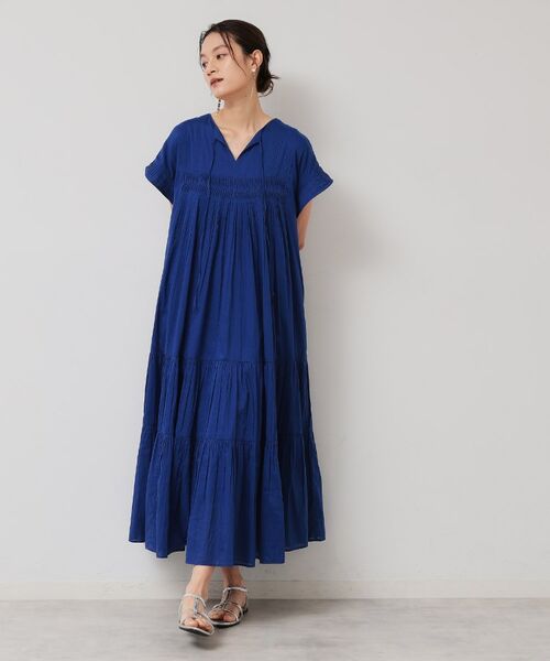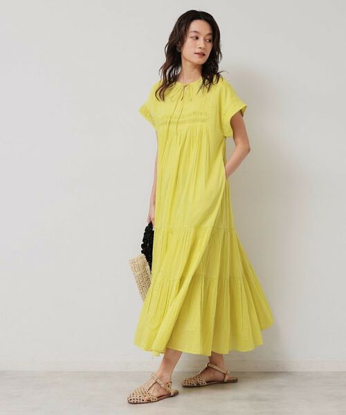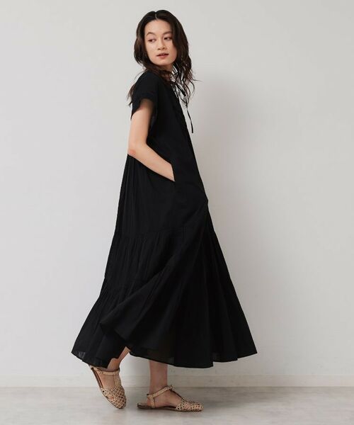 ティアードの切り替えにギャザーフレアを入れ、動くたびに表情が叶うマキシワンピース。
