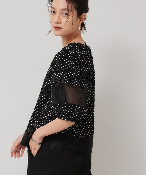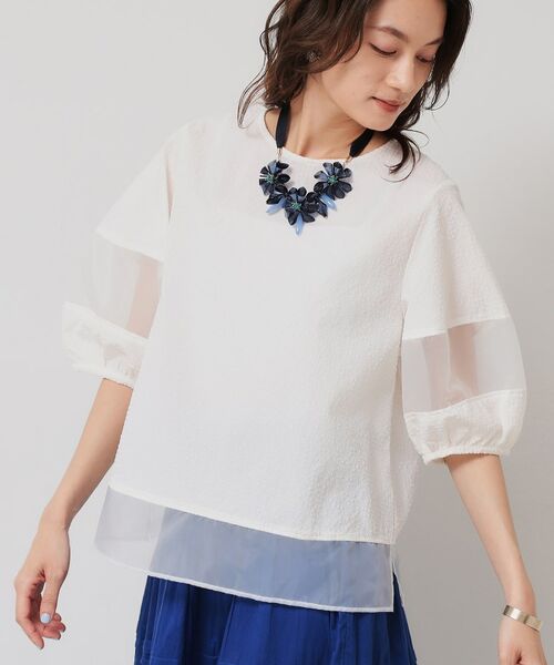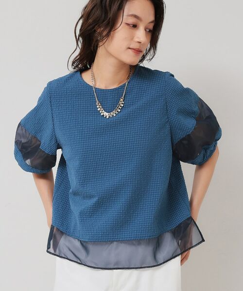 本体はサッカー地を、袖と裾にオーガンジーを使用したTブラウス。