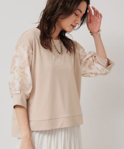 本体は落ち感のある程よい薄地の合繊素材を、袖にはチュールに繊細は小花柄の刺繍を施したレース素材を使用しています。