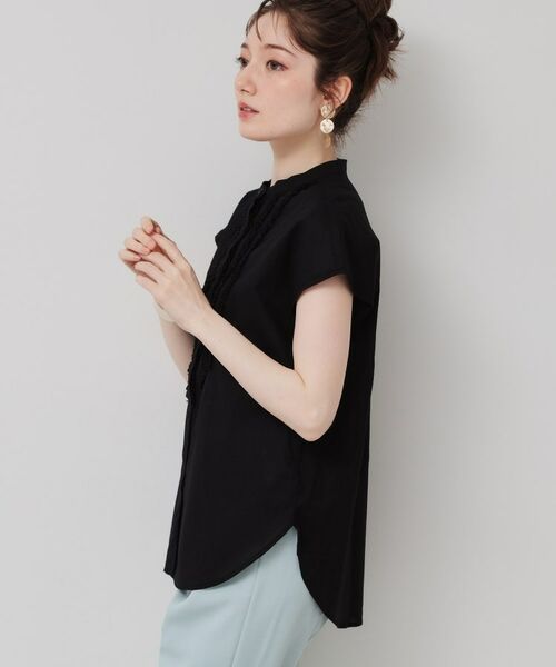 【デザイン】細幅フリルを身頃にあしらった装飾的なブラウス。フリルにたっぷりとギャザーが入っているため、フリル自体が立ち上がり、着ると立体的に見える1枚。ジャケットのインナーなど、1枚着るだけでお顔周りを華やかに見せてくれるためアクセサリーいらずなアイテムです。【素材】細番手の糸で織りあげられた薄手の平織りの素材です。肌触りが滑らかで清涼感があり、肌になじむ風合いが特徴です。【スタイリング】着回ししやすいオフ・クロ、華やかなオレンジの3色展開です。※バイイング商品のため、洗濯表示・注意事項等は、本製品でご確認ください。※照明の関係により、実際よりも色味が違って見える場合があります。また、パソコン・スマートフォンなどの環境により、若干製品と画像のカラーが異なる場合もございます。本商品は、ご注文確定後に取り寄せにてお客様への出荷手配をさせていただきますので、お届けまでに7~10日前後かかる場合がございます。また、商品は他社サイトと在庫を共有しているため、ご注文いただいた商品が欠品となり、キャンセルとなる場合がございます。