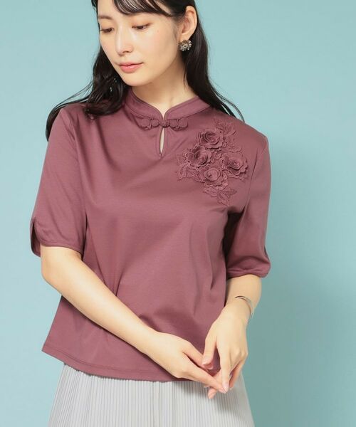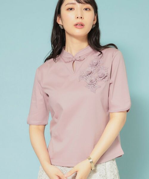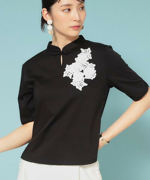上品感のあるケミカルレースを衿元に施したSunaUnaらしいチャイナカラーのカットソー。