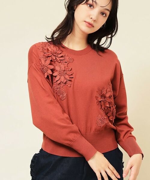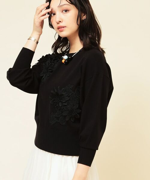 右胸と左裾に3種類のレースを重ね付けしておりボリューム感がありながら、同色レースなので着こなし易く仕上がっています。