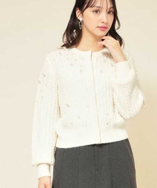 【デザイン】大小のフェイクパールをたっぷりと散りばめたハンド刺繍の贅沢感。オーセンティックな総ケーブル柄とフェイクパールが醸し出す女性らしい遊び心がポイントです。コンパクトな身頃にふっくらしたパフスリーブの袖がフェミニンなムードに。【素材】紡毛糸とヘアリーなウール混の糸を合わせて編み、ケーブル柄の立体感が出て暖かみを感じる編地。ミドルゲージながら近年の高い気温感に合わせて着易いように厚すぎない肉感。【着こなしポイント】カーディガンとしてだけではなく、前を閉めてプルオーバーとしてもお勧めです。※照明の関係により、実際よりも色味が違って見える場合があります。また、パソコン・スマートフォンなどの環境により、若干製品と画像のカラーが異なる場合もございます。本商品は、ご注文確定後に取り寄せにてお客様への出荷手配をさせていただきますので、お届けまでに7~10日前後かかる場合がございます。また、商品は他社サイトと在庫を共有しているため、ご注文いただいた商品が欠品となり、キャンセルとなる場合がございます。