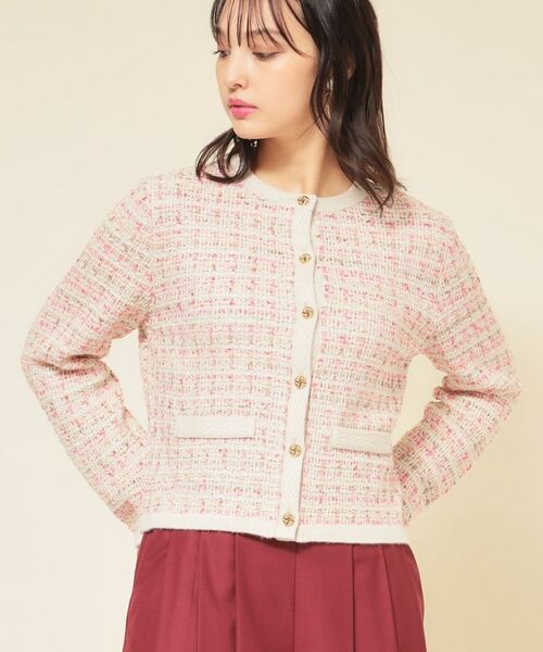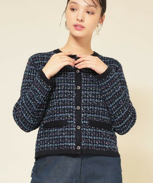きちんと感と華やかさを叶え、普段使いの出来るニット編地のツイード調カーディガン。