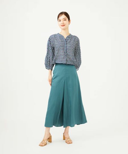 基布にシルクを用い、柔らかさと美しい光沢感が特徴のベルベットワイドパンツ。 ベルベットの素材感と分量感が相まって美しいドレープ感を演出し上品な仕上がりです。 ウエストを総ゴムにする事で、サイズフリーで着心地の良い仕様も嬉しいアイテムです。同じお作りのプリーツスカート【GBHAK09360】もございます。