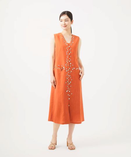 アクセサリーを身に着けているかのように、ランダムに貝ボタンを散りばめたジレドレス。