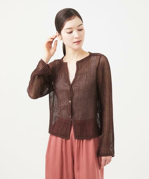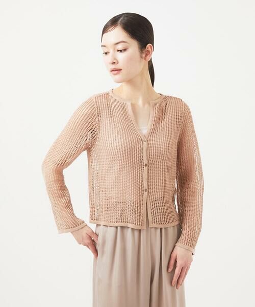 ネット状の編地で、襟元をすっきりと仕上げたカーディガン。