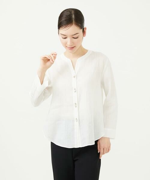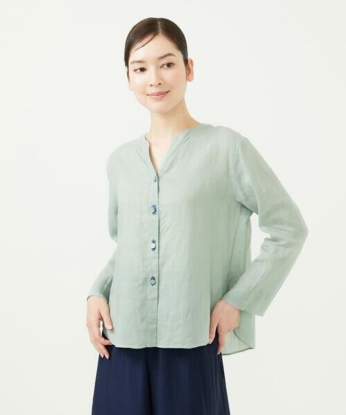 涼しげなリネンローンを使用した前開きタイプのブラウス。