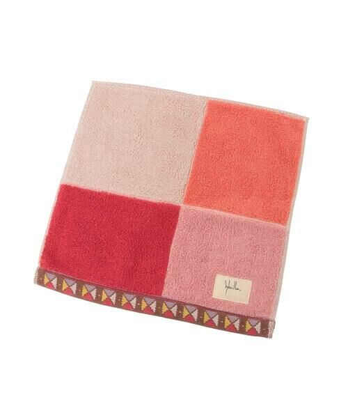 配色ブロックの組み合わせとモチーフラインアクセントがポイントのタオルハンカチ。