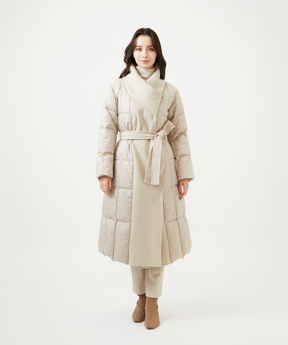 ショールのような優雅な襟、前中心にウール素材を使用したロングダウン。