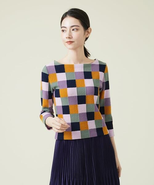 今季のテーマであるCalm color(静寂・落ち着いた色)を、カラーブロックのインターシャで表現したプルオーバー。