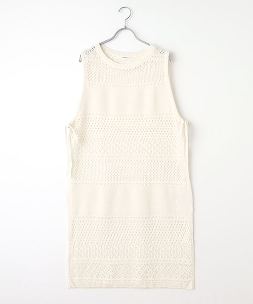 さまざまな透かし柄をボーダーになるように組み合わせたニットのロングジレです。